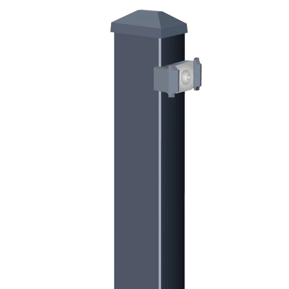 Die Edelstahlplättchen der geraden Pfosten sind Anthrazit (RAL 7016) pulverbeschichtet, die Edelstahlplättchen der Eckpfosten sind verzinkt.
