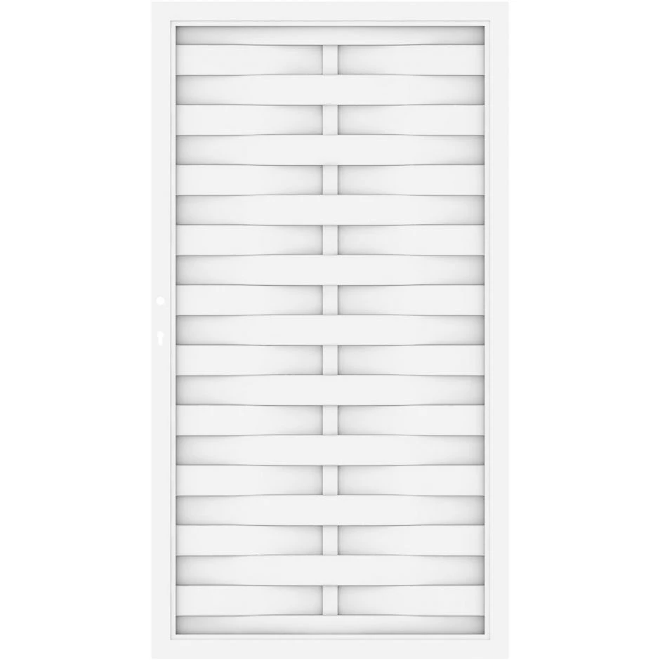 Das Tor für den LONGLIFE ROMO Sichtschutzzaun in weiß vereint pflegeleichten Fensterkunststoff mit traditionellem Flechtzaun Design. Das blickdichte Tor in Flechtzaunbauweise hat einen 68×48 mm starken Rahmen. Außerdem sind die Rahmenecken mit acht Eckstabilisatoren zusätzlich verstärkt, was das Tor enorm stabil macht. Die Streben sind doppelt edelstahlverschraubt. Die Lamellen haben eine glatte Oberfläche mit Dekorfase und sind 6×82 mm groß. Das Tor ist 98×180 cm groß und kann DIN rechts oder DIN links anschlagend montiert werden. Es wird inklusive Einsteckschloss und Torbeschlag geliefert. Die Integration in ein Schließsystem ist möglich. Der hochwertige Fensterkunststoff macht das Tor extrem pflegeleicht und lange haltbar. Es bleibt dauerhaft schön und müssen nie gestrichen werden! Einfach abwaschen ist völlig ausreichend.