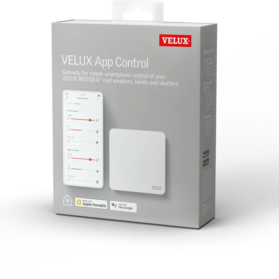Mit dem VELUX App Control KIG 300 können Sie alle VELUX INTEGRA Produkte bequem von unterwegs aus steuern. Die Bedienung erfolgt per Smartphone oder per Sprachsteuerung durch KompatibilitÀt zu dem Sprachassistenten Google Assistent oder Apple Home-Kit.