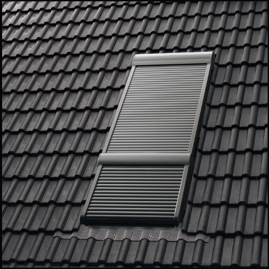 Der VELUX Rollladen SMG 0000 ist von auĂen dunkelgrau und passend zum Dachfenster.