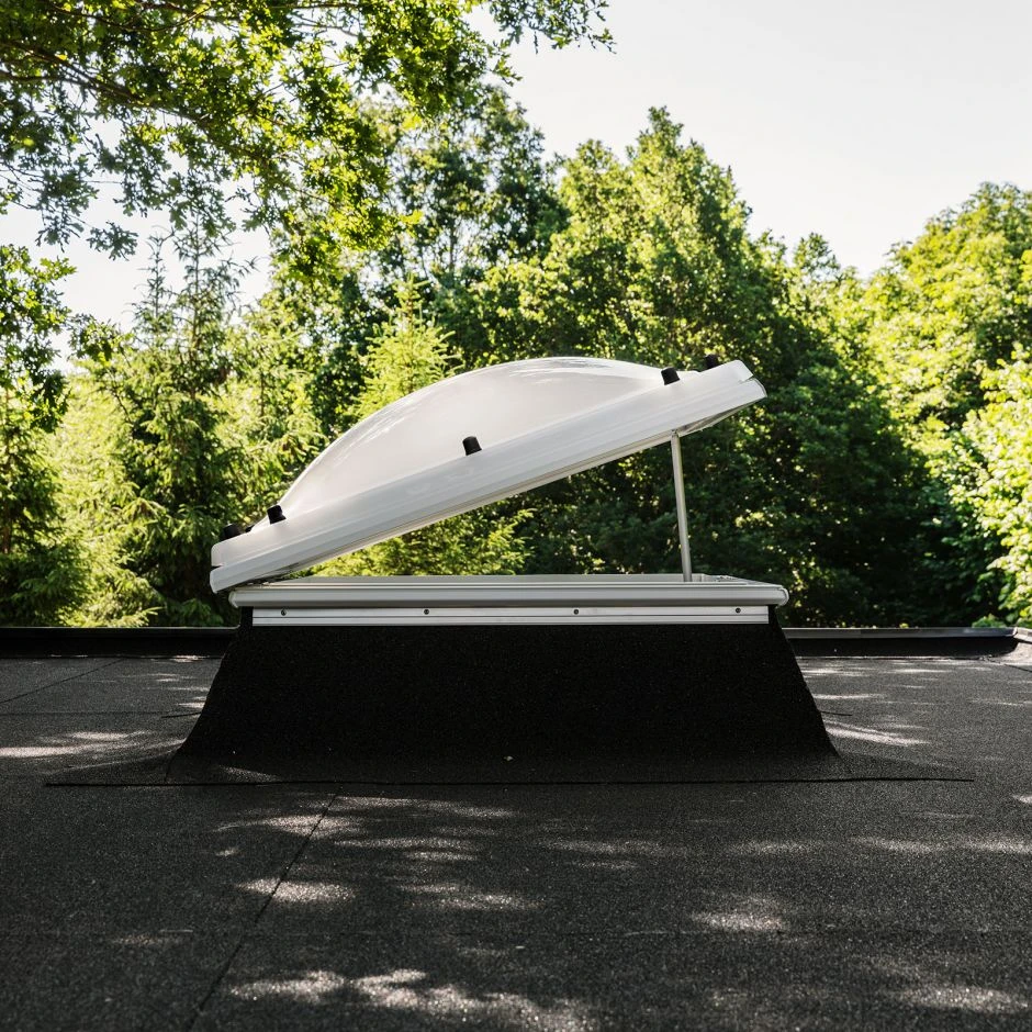 Das VELUX Lichtkuppel Basis-Element CVJ 1210 in elektrischer AusfĂŒhrung (230V) mit Spindelmotor (300mm Hubhöhe) fĂŒr unbeheizten Hallen unter flachen DĂ€chern von 0° bis 15°.